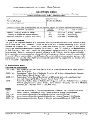 Rajendra Gajula is a postdoctoral fellow at Johns Hopkins University School of Medicine. He received his BS in Biology and Chemistry from Kakatiya University in India in 1998, an MSc in Biochemistry from University of Hyderabad in India in 2001, and a PhD in Biotechnology from National Center for Cell Science in India in 2008. His PhD and postdoctoral research has focused on the roles of long noncoding RNAs and transgenic mouse models in tumorigenesis. He has expertise in molecular and cell biology techniques relevant to investigating Twist1-induced resistance to EGFR inhibitors in lung cancer.
