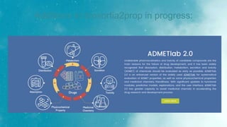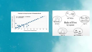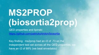 The document discusses an algorithm called ms2prop that was developed for predicting QED properties and Lipinski rules. It achieved an r-squared value of 0.73 on an independent test set. The document also mentions continuing work on a calculator tool for biosortia2prop that would require citing the developer if used. Methods like lasso regression, elastic net, and evaluating regression quality using r-squared are briefly covered. Models built using scikit-learn on QED test data achieved r-squared values of 1. Finally, future goals of finishing the calculator and screening compounds are stated.