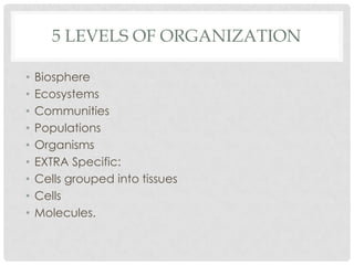 This document summarizes the major levels of biological organization (biosphere, ecosystems, communities, populations, organisms) and describes the key characteristics of major biomes, including tundra, taiga, temperate deciduous forest, temperate grasslands, desert, savanna, and tropical rainforest. It provides temperature, precipitation, dominant species, and distinguishing features of each biome.