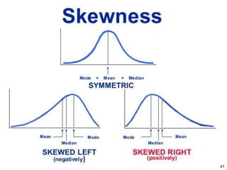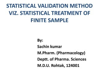 This document describes various statistical validation methods used to analyze finite sample data, including measures of central tendency, dispersion, skewness, correlation, and regression. It also discusses different types of statistical tests like the t-test, F-test, and ANOVA that are used to test hypotheses and determine statistical significance. The document provides examples and formulas for calculating various statistical measures and performing tests on sample data sets.