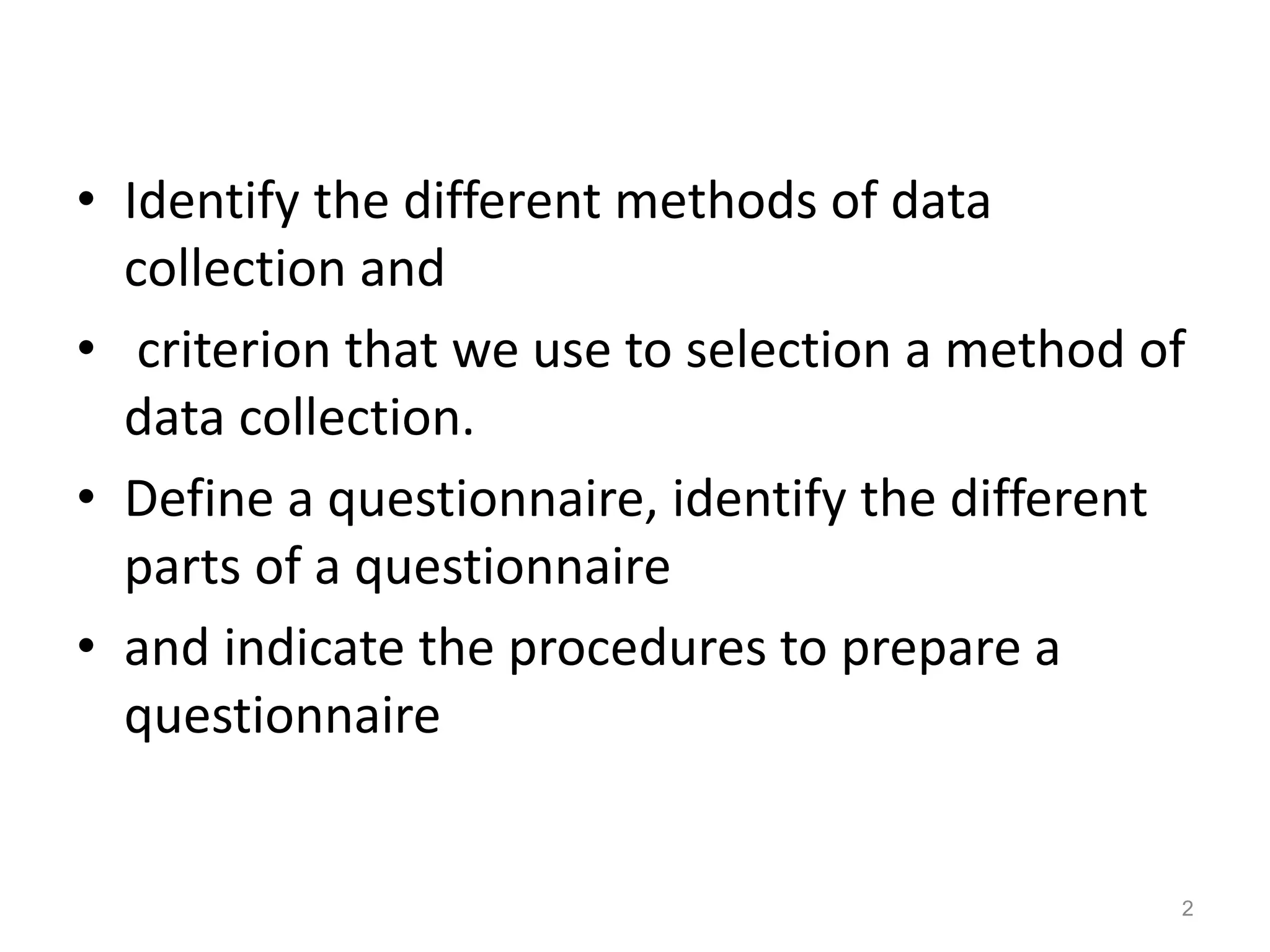 This document discusses different methods for collecting data, including observation, interviews, questionnaires, and using documentary sources. It provides details on each method, such as how to conduct interviews and structure questionnaires. It also covers the advantages and disadvantages of each approach to collecting data. The key methods discussed are observation, interviews, questionnaires administered in-person or via mail, and obtaining data from existing documentation and records.