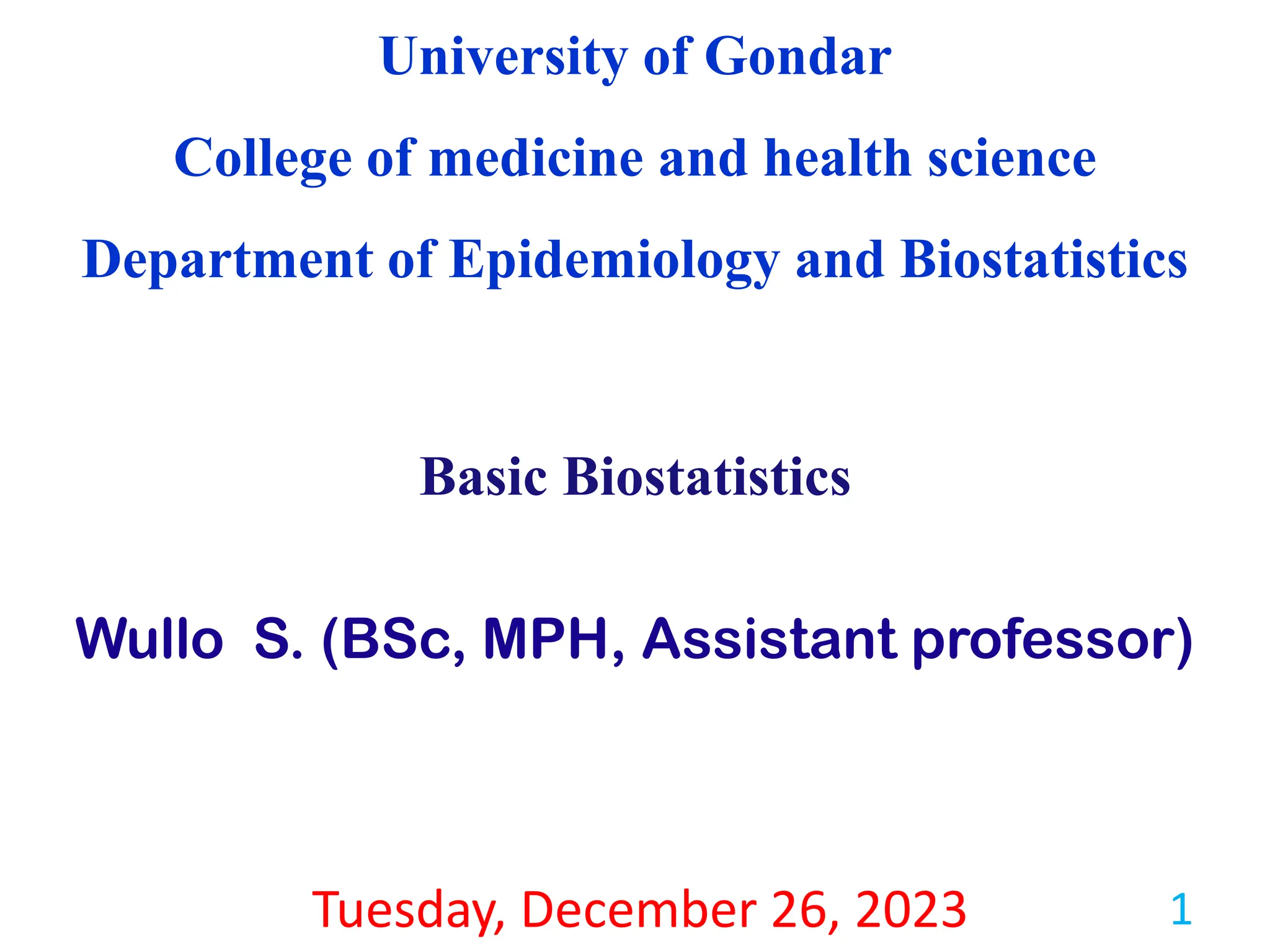 This document provides an introduction to basic biostatistics. It defines biostatistics as the application of statistical methods to biological and health sciences. Biostatistics has two main branches - descriptive biostatistics which summarizes data, and inferential biostatistics which draws conclusions from samples. The document discusses different types of data, variables, and measurement scales including nominal, ordinal, interval and ratio scales. It also covers topics like population and sample, parameters and statistics, and the stages of a statistical investigation.