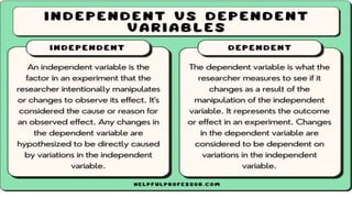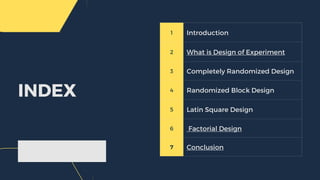 This document discusses different experimental designs used in analysis of variance (ANOVA). It describes the completely randomized design, randomized block design, Latin square design, and factorial design. For each design, it covers key aspects like blocking, randomization, replication, and advantages/disadvantages. The goal of experimental designs is to reduce experimental errors and improve precision when investigating relationships between independent and dependent variables.