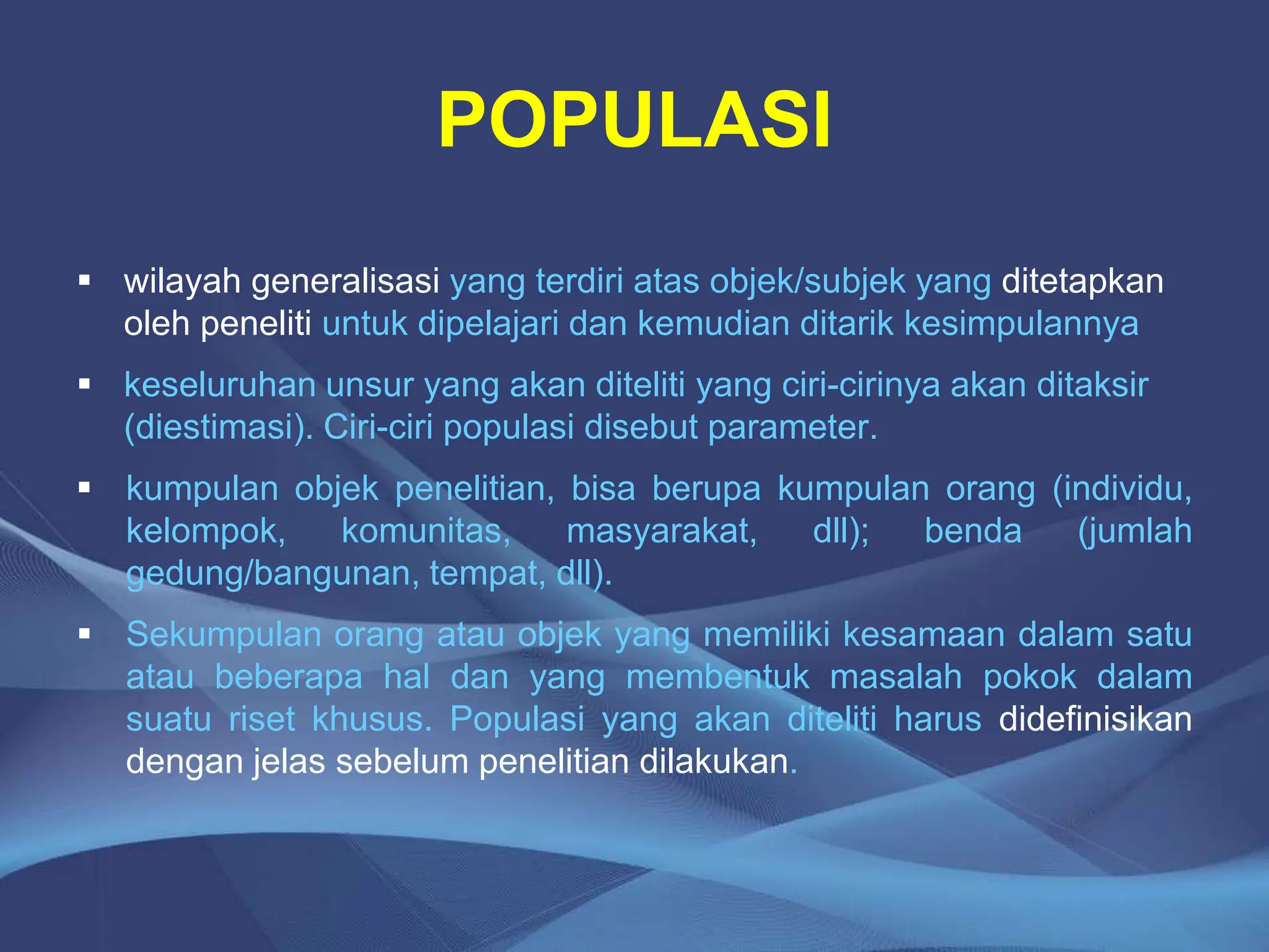Dokumen ini membahas tentang populasi dan teknik pengambilan sampel dalam penelitian, mencakup definisi populasi, ciri-ciri sampel, serta metode sampling baik probabilitas maupun non-probabilitas. Ditekankan pentingnya ukuran sampel yang representatif untuk mencapai akurasi dan presisi dalam penelitian. Selain itu, terdapat penjelasan mengenai berbagai rumus dan metode untuk menentukan ukuran sampel yang sesuai dengan berbagai jenis penelitian.