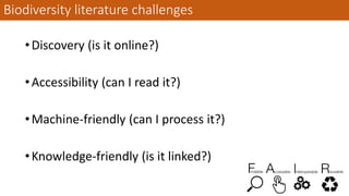 This document discusses challenges with accessing and processing biodiversity literature and describes efforts to make literature from Biodiversity Heritage Library (BHL) more accessible and machine-readable. BioStor extracts text and figures from over 200,000 BHL articles and makes them searchable online. Efforts are underway to link BHL content to databases and Wikidata to connect literature to species and other entities. The goal is to extract more articles from BHL, enable geographic searches of content, break articles into smaller pieces, and embed literature within a biodiversity knowledge graph.