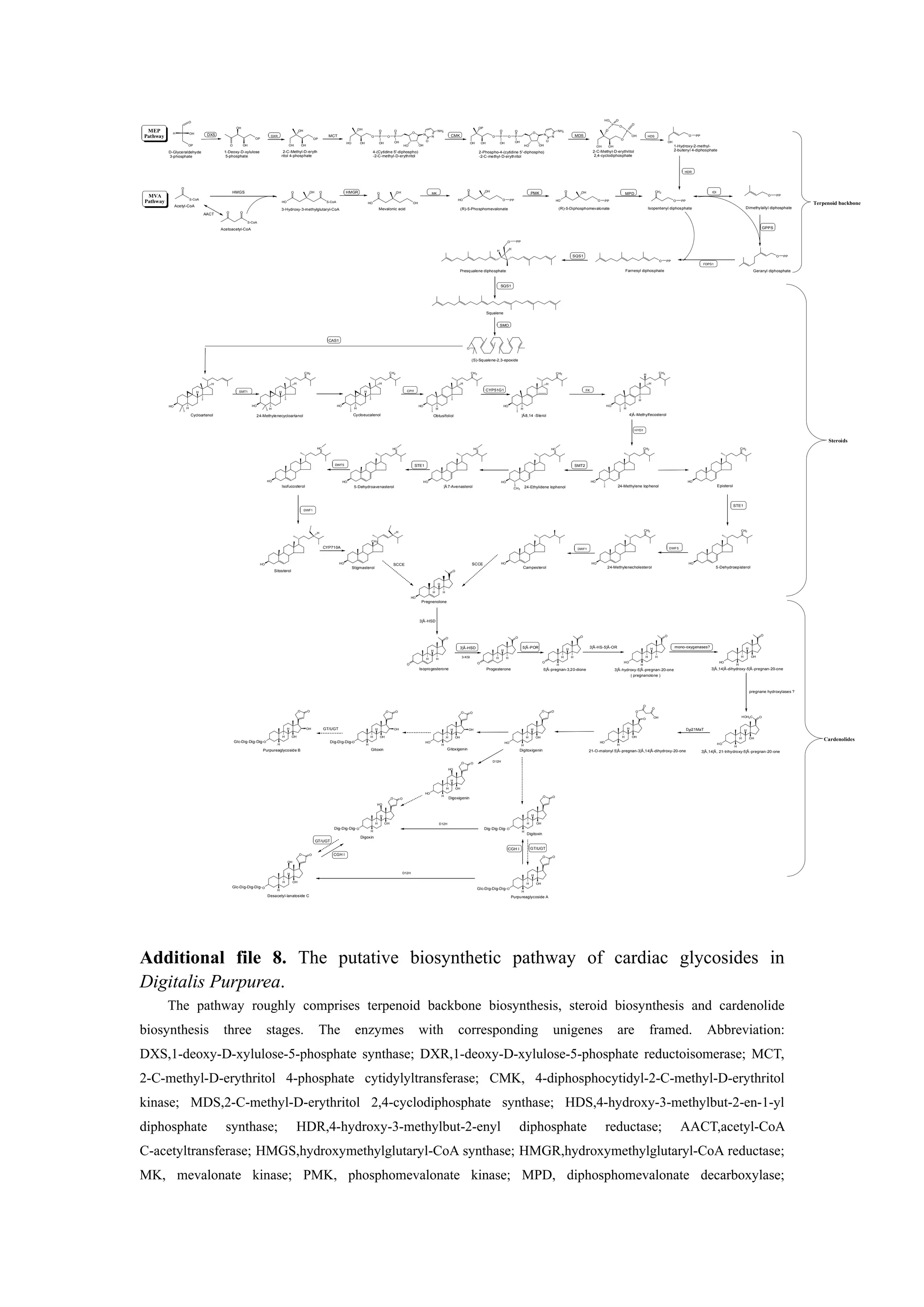 This document outlines the putative biosynthetic pathway of cardiac glycosides in Digitalis purpurea. The pathway involves three main stages: terpenoid backbone biosynthesis, steroid biosynthesis, and cardenolide biosynthesis. The terpenoid backbone biosynthesis involves the mevalonate (MVA) pathway and 2-C-methyl-D-erythritol 4-phosphate (MEP) pathway. The steroid biosynthesis involves enzymes that convert acetyl-CoA to various sterols. The cardenolide biosynthesis stage involves enzymes that modify sterols to produce cardenolide compounds through hydroxylation, acetylation, and glycosylation reactions. Key enzymes are identified for each stage of the pathway.
