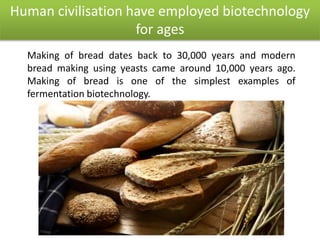 Biotechnology has been used for thousands of years to produce foods and materials through fermentation and selective breeding. Modern biotechnology began in the 1970s with genetic engineering techniques allowing manipulation of organisms at the molecular level. While biotechnology has benefits like producing lifesaving drugs and drought-resistant crops, it also raises ethical issues regarding genetic modification and patenting of life. Governments aim to balance biotechnology development with responsible social and environmental oversight to ensure its safe and equitable progress.