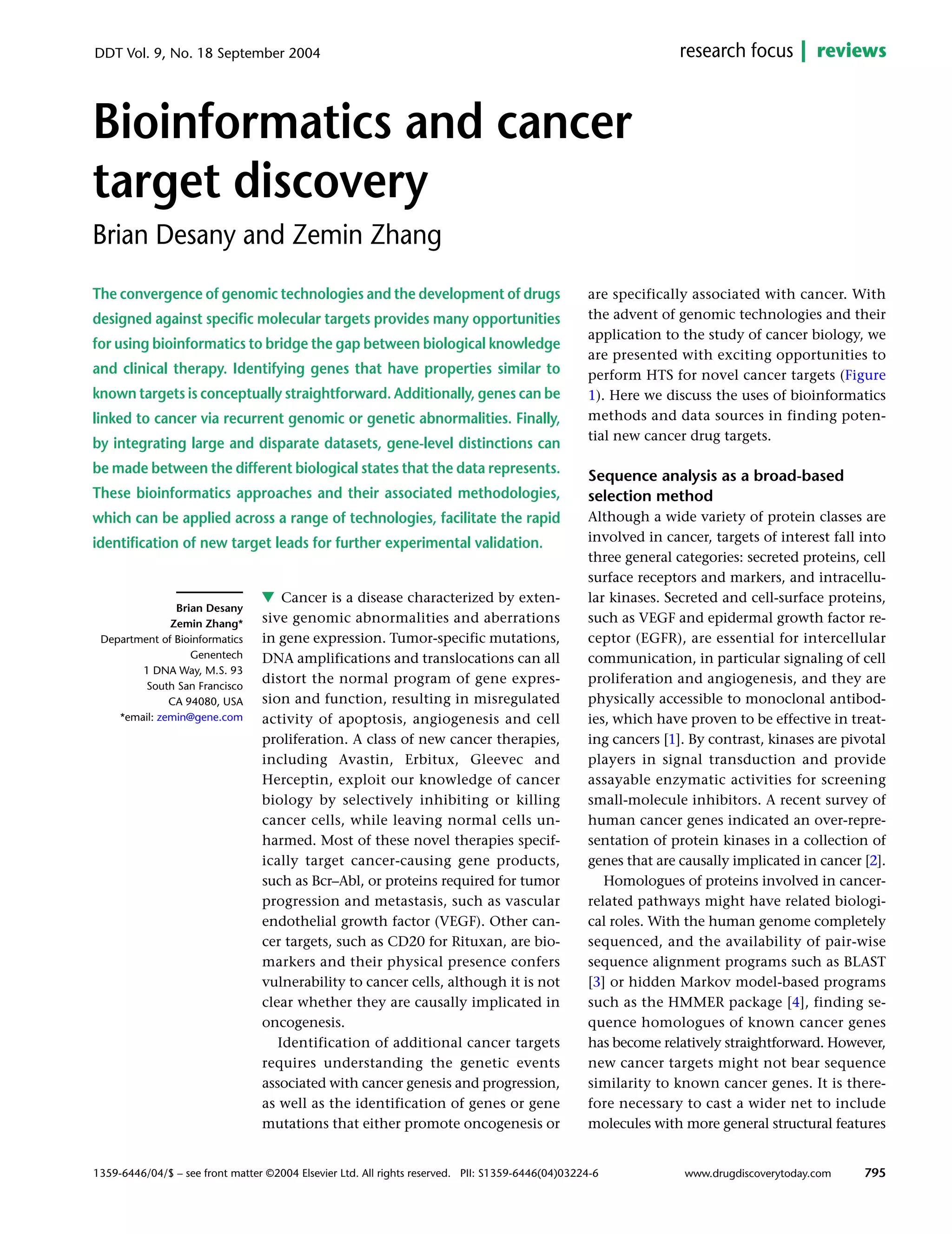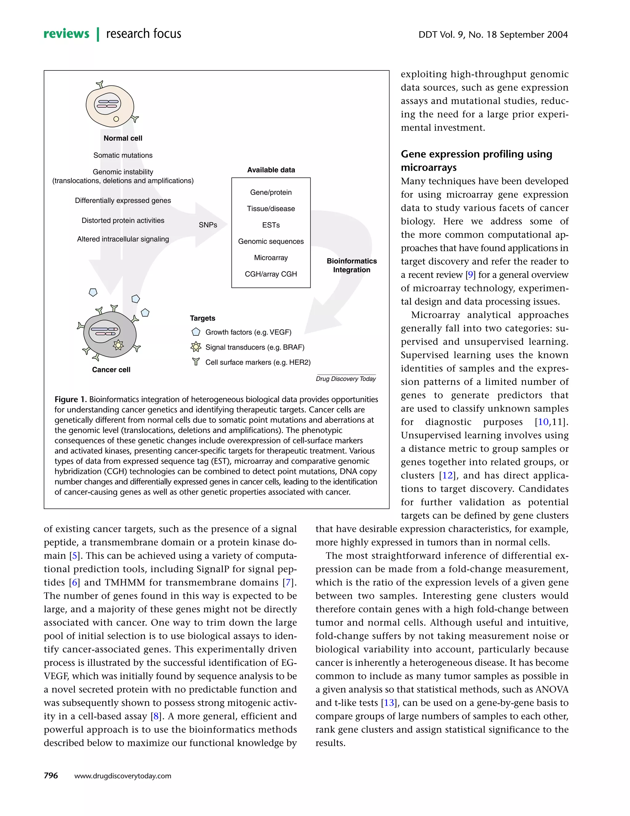 The document discusses how bioinformatics can be used to identify new cancer drug targets. It describes analyzing gene sequences to find homologs of known cancer genes. Microarray data can be mined to find genes that are differentially expressed in cancer versus normal tissues. Digital expression data from EST and SAGE tags provides an alternative to microarrays for expression profiling. Integrating diverse genomic and expression data through bioinformatics approaches facilitates rapid identification of potential new drug targets for experimental validation.