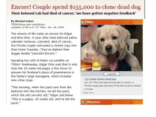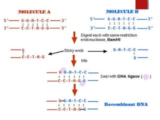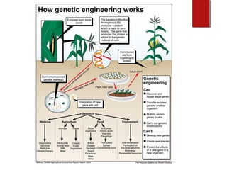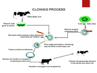 The document discusses various topics in biotechnology including the human genome project, genetic engineering, cloning, stem cells, and DNA fingerprinting. It provides details on how scientists mapped the human genome using techniques like DNA sequencing, restriction fragment-length polymorphisms, yeast and bacterial artificial chromosomes, polymerase chain reaction, and electrophoresis. Genetic engineering techniques like gene splicing and restriction enzymes are described. Applications and debates around cloning, genetic engineering, and stem cells are also summarized.