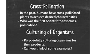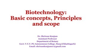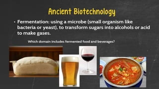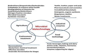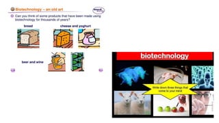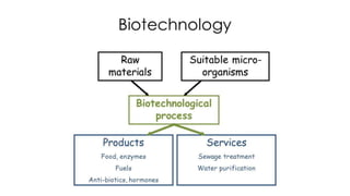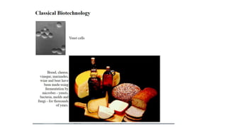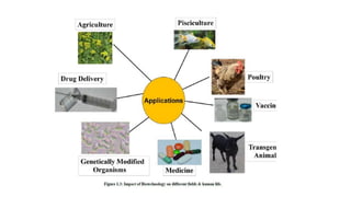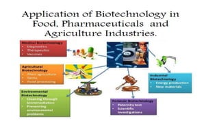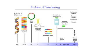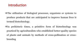 This document provides an overview of biotechnology, including its definition, history, concepts, and applications. It discusses how biotechnology has evolved from early domestication of plants and animals, to modern applications using genetic engineering and recombinant DNA techniques. Key events highlighted include Mendel's work on inheritance in the 1800s, and the discoveries of DNA structure and recombinant DNA techniques in the 1950s-70s which formed the basis of modern biotechnology. The document also outlines various branches and applications of biotechnology in areas like agriculture, medicine, industry, and environment.