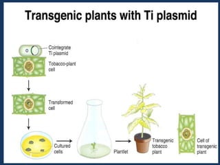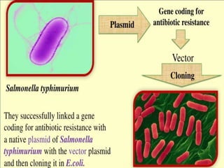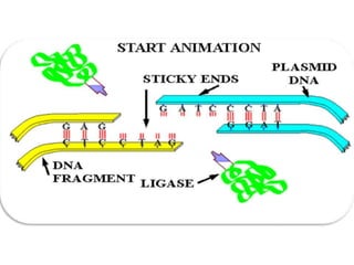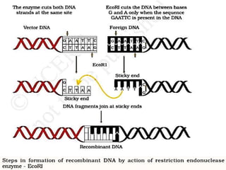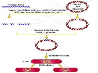 The document discusses biotechnology and recombinant DNA technology. It defines biotechnology as using organisms or enzymes from organisms to produce useful products. Recombinant DNA technology involves isolating DNA, fragmenting it with enzymes, inserting fragments into vectors, transforming host cells, and culturing the cells to multiply the DNA. The basic steps are isolating a gene, inserting it into a vector, introducing the vector into a host cell, and using the host to generate multiple copies of the gene.