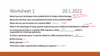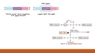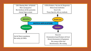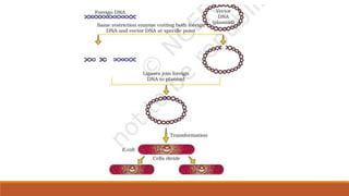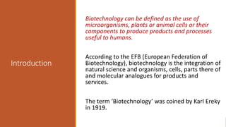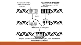 The document elaborates on biotechnology, emphasizing the use of microorganisms, cells, and genetic engineering tools for producing products beneficial to humans. It discusses key concepts and processes in recombinant DNA technology, including the roles of restriction enzymes, cloning vectors, and various techniques for gene transfer and transformation. Additionally, it highlights the differences between traditional and modern biotechnology, focusing on innovations such as artificial recombinant DNA and the use of specific enzymes for genetic manipulation.