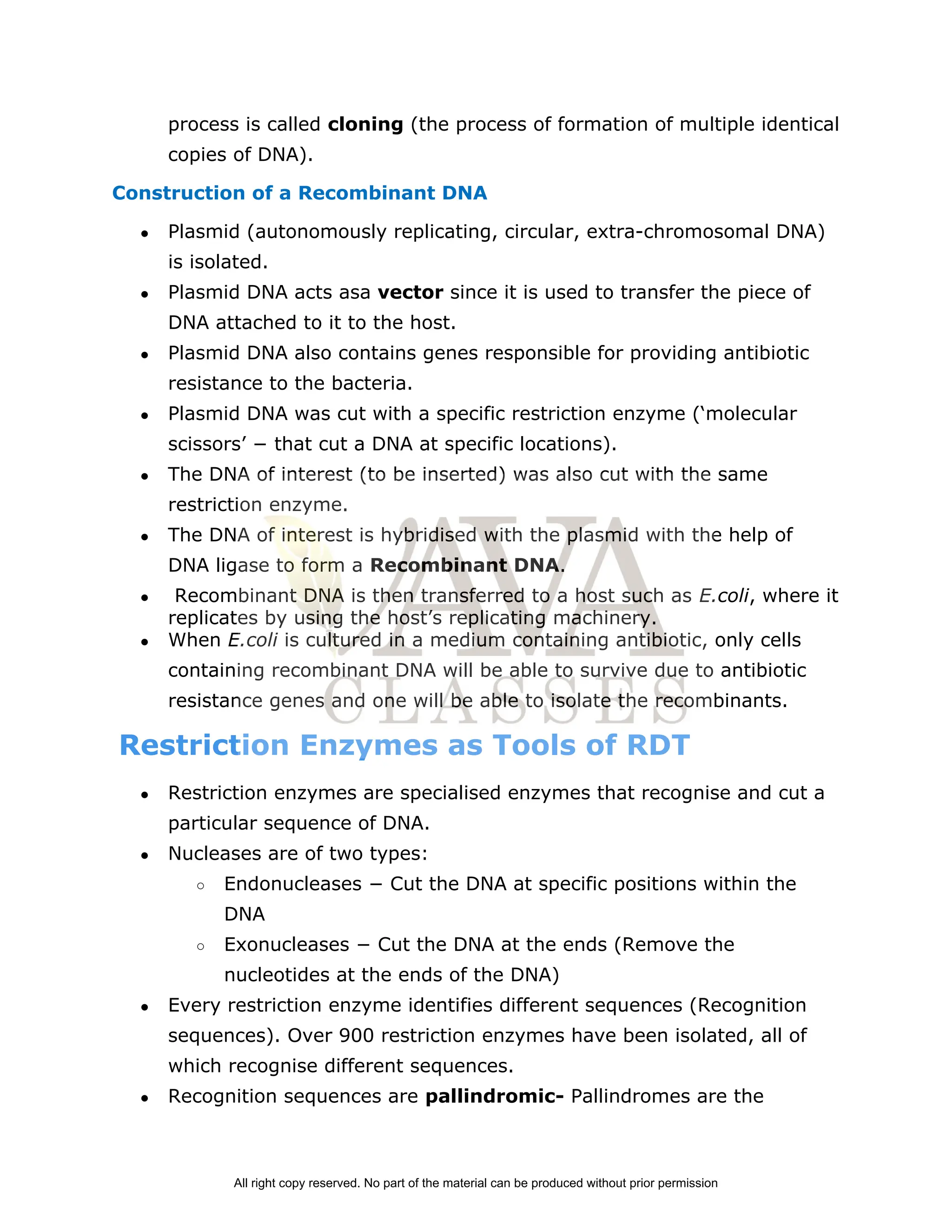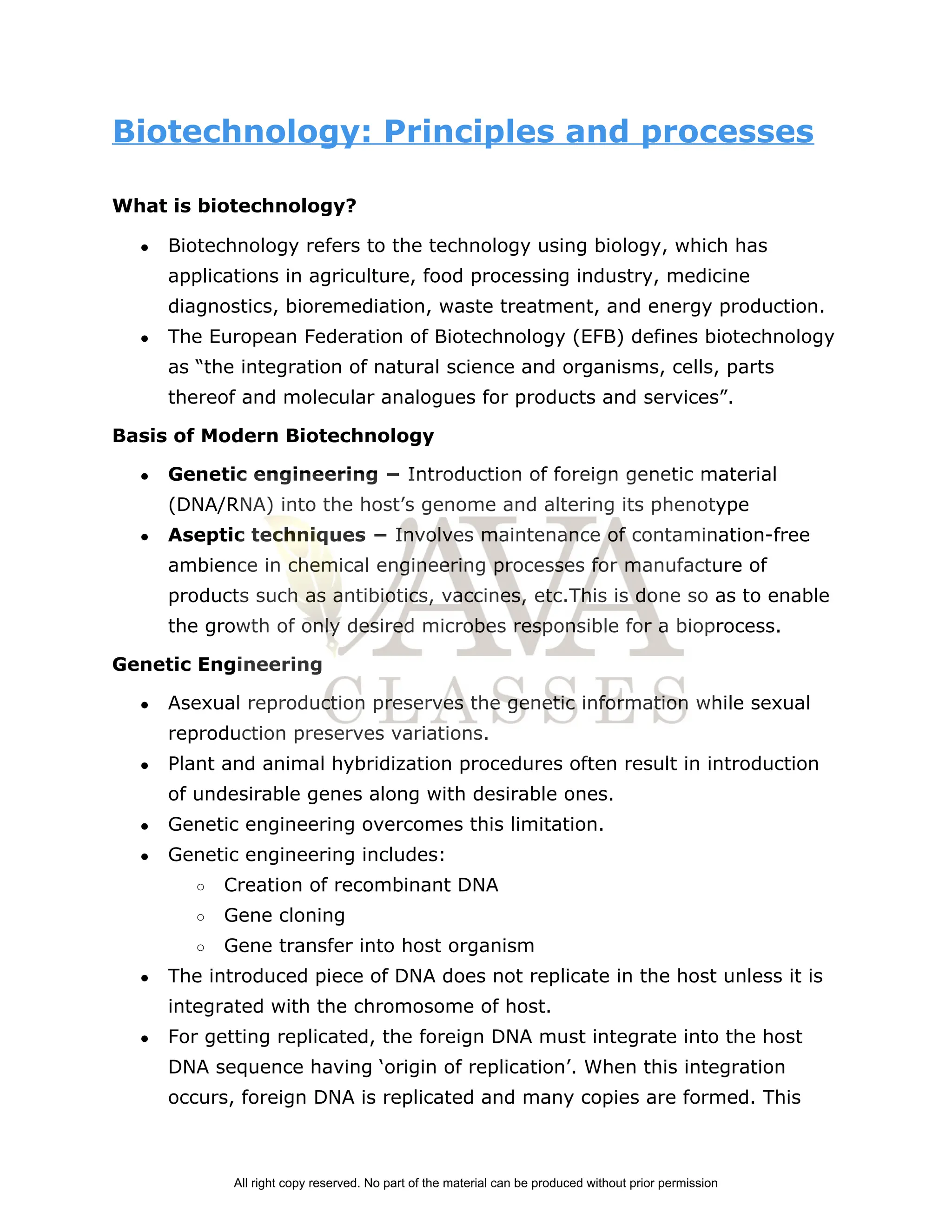 Biotechnology utilizes biological processes for applications in agriculture, medicine, and environmental management, defined as the integration of natural science with living organisms by the European Federation of Biotechnology. Key techniques include genetic engineering for DNA manipulation and cloning, using vectors like plasmids and bacteriophages for gene transfer, and methods such as PCR for DNA amplification. The document covers processes from isolation and cutting of DNA using restriction enzymes to downstream processing for producing recombinant products.