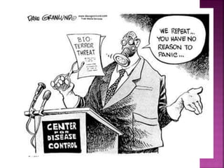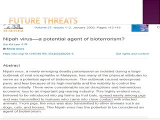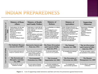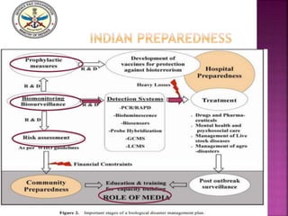 The document discusses bioterrorism preparedness in India. It provides details on India's national agencies for disaster management, including the National Disaster Management Authority and National Disaster Response Force. It also outlines India's disease surveillance network and biosafety levels for handling microorganisms. The document notes India's biodefense research centers and the country's strengths and weaknesses in addressing potential bioterrorism threats.