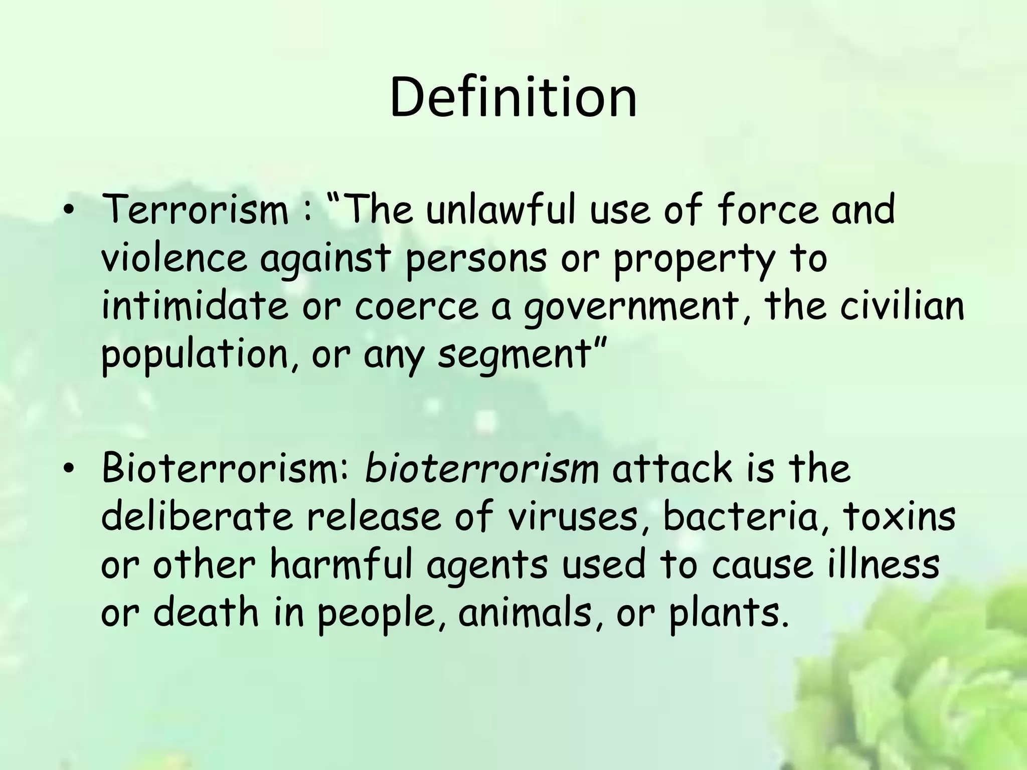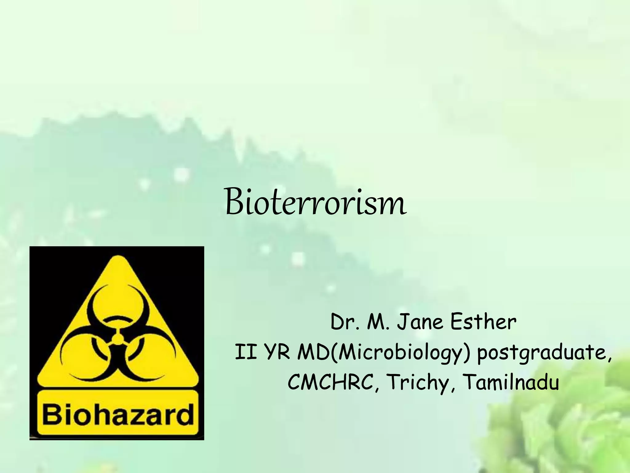 The document discusses bioterrorism, defining it as the deliberate release of harmful biological agents to cause illness or death. It outlines the characteristics of biological agents used, historical attempts at biological warfare, and classifications of bioweapons such as CDC categories A, B, and C. Additionally, it emphasizes the need for preparedness against potential bioterrorism attacks through familiarization, disaster planning, and advanced detection systems.