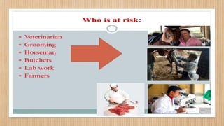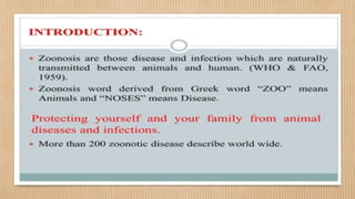 This document discusses bio-threat diseases and priorities for disease prevention, detection, and response in Iraq. It notes that according to the WHO, the top zoonotic diseases of concern in Iraq are rabies, hemorrhagic fevers, and anthrax. It also mentions that the Iraq MOH is prioritizing surveillance for diseases like brucellosis, and that the MOA conducts passive surveillance of animal diseases. Finally, it provides statistics on the spread of diseases from animals to humans, such as that 60% of existing human infectious diseases and at least 70% of emerging diseases originate in animals.