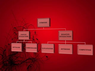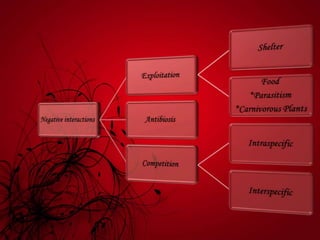 Mutualism includes relationships like mycorrhizal fungi and plant roots, nitrogen-fixing bacteria and legumes, and lichens. Commensalism includes epiphytic plants, lianas that climb trees, and epizoic algae on animal fur. Negative interactions include exploitation like parasites on plants and animals and carnivorous plants. Antibiosis refers to inhibition or death of one organism by another through metabolic toxins. Competition occurs when organisms seek inadequate resources and can be intraspecific between members of a species or interspecific between different species.