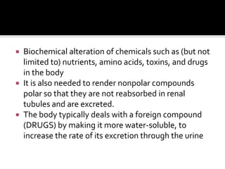 The document discusses drug metabolism and biotransformation in the liver. It notes that the liver uses metabolic enzymes to make nonpolar compounds more water soluble through oxidation, reduction, and hydrolysis reactions so they can be excreted in urine. These phase I reactions introduce or expose polar groups. Phase II then involves conjugating the metabolite to glucuronic acid, sulfate, or glycine for excretion. The major sites of these reactions are the microsomal and cytoplasmic enzymes in hepatic cells.