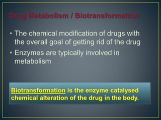 1. Drug metabolism involves enzymatic modification of drugs by the body with the goal of making them more water soluble and easier to excrete.