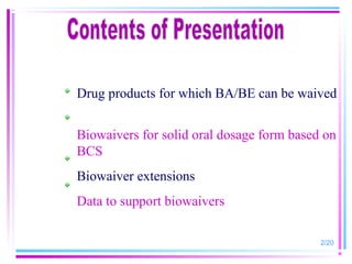 The document discusses biowaivers for solid oral dosage forms based on the Biopharmaceutics Classification System (BCS). It describes the four BCS classes based on a drug's solubility and permeability characteristics. For highly soluble, highly permeable Class 1 drugs, in vivo bioavailability/bioequivalence studies can be waived if the test and reference products have rapid dissolution. The document outlines methods for determining solubility and permeability to classify drugs. It also discusses potential biowaiver extensions for Class 3 drugs or drugs with pH-dependent solubility if dissolution is very rapid.