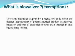 The document discusses biowaivers, which are exemptions granted by regulatory bodies from requiring in vivo equivalence testing when approving pharmaceutical products. A biowaiver can be requested for immediate-release solid oral dosage forms containing Class I or some Class III drugs according to the Biopharmaceutics Classification System (BCS). To qualify, the drug must have high solubility and permeability, and the product must demonstrate rapid dissolution. Excipients in the product also cannot affect drug absorption. Biowaivers do not apply to narrow therapeutic index drugs or products intended for oral cavity absorption.