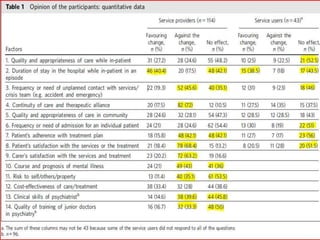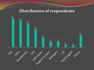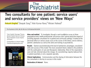 This document summarizes a study that investigated health professionals', service users', and carers' opinions about having separate consultants for inpatient and community mental health settings. The study found mixed opinions, with some concerns that the functional model could negatively impact continuity of care, therapeutic relationships, and training of professionals. While it may improve efficiency, respondents felt it could undermine patient trust and care. The study highlights the need for further research on the long-term impacts of this model.