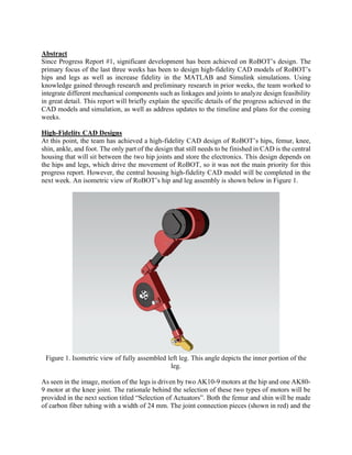 This progress report details significant advancements in the design of a low-cost humanoid robotic testbed, focusing on high-fidelity CAD models of the robot's hips and legs, and updates on actuator selection. The team resolved mechanical power transmission issues by opting for belt and pulley systems and successfully created a functional MATLAB model for robot locomotion. Future work aims to finalize CAD models, optimize MATLAB simulations, and prepare for an upcoming oral presentation.