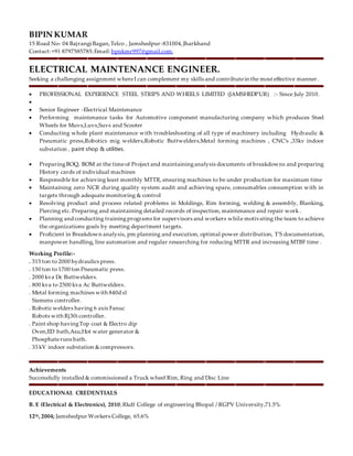 Bipin Kumar is an electrical maintenance engineer seeking a challenging position where he can utilize his skills. He has over 10 years of experience in electrical maintenance for an automotive components manufacturer, where he performs maintenance on various machinery including hydraulic presses, robotic welders, CNC machines, and a 33kV substation. He is responsible for minimizing downtime, ensuring production targets are met, and resolving issues. Bipin holds a B.E. in Electrical and Electronics Engineering and has experience with preventative maintenance planning, line automation, and research to improve equipment uptime and performance.