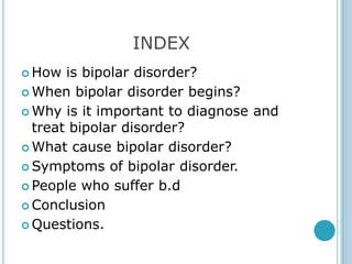 Bipolar disorder is a mental illness characterized by periods of depression and elevated mood. It is caused by both genetic and environmental factors that result in abnormalities in brain structure and function. The symptoms of bipolar disorder include nervousness, anxiety, sadness, talking very fast, inability to relax or sleep, being overly active, and thoughts of death or suicide. It is important to diagnose and treat bipolar disorder early through medication and therapy in order to prevent suicide, substance abuse, relationship problems, and work issues. Famous people who are known to have bipolar disorder include Vincent van Gogh, Elizabeth Taylor, Britney Spears, and Catherine Zeta-Jones.