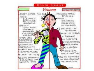 Bipolar disorder is characterized by recurrent episodes of mania and depression. It is classified into Bipolar I and II based on the severity of manic episodes. The exact causes are unknown but genetic and biochemical factors are thought to play a role. Clinical features include changes in mood, energy, sleep patterns, and risk-taking behavior. Treatment involves mood stabilizers like lithium, antipsychotics, and antidepressants to control symptoms and prevent future episodes. Prognosis depends on factors like comorbidities, stress levels, and medication compliance.