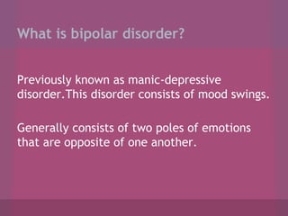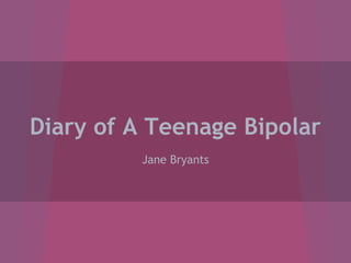 This document is a diary from a teenage individual describing their experience with bipolar disorder. It provides information on what bipolar disorder is, potential causes, common symptoms, risk factors and phases. It also discusses treatment options like mood stabilizers, psychotherapy and coping strategies. Statistics are given on the prevalence of bipolar disorder in the US and challenges associated with diagnosis. The diary entries discuss personal struggles with anger, mania, depression and forgetting medication, but also positive coping mechanisms learned.