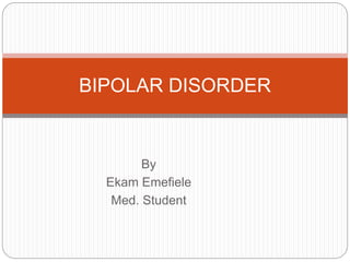 Bipolar disorder is a mental illness characterized by extreme mood swings from mania to depression. It affects about 0.6-0.9% of the population. While the exact cause is unknown, it is believed to involve genetic and environmental factors. Symptoms include changes in mood and behavior during manic, depressive, hypomanic or mixed episodes. There are several types of bipolar disorder that are diagnosed based on the severity and length of episodes. Treatment involves medications, psychotherapy, and in some cases electroconvulsive therapy, with the goals of managing mood swings and preventing relapse. Proper long-term treatment can help people with bipolar disorder lead productive lives.