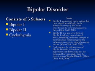 Bipolar disorder consists of three subsets: Bipolar I, Bipolar II, and Cyclothymia. Bipolar I involves severe mood swings that significantly impair functioning, while Bipolar II is a milder form with less severe episodes. Cyclothymia is the mildest form with milder highs and lows. The causes of bipolar disorder are believed to include biological, neurochemical, genetic, and environmental factors. Treatments include psychotherapy, medication, and sometimes hospitalization. Common medications are mood stabilizers, anticonvulsants, antidepressants, and antipsychotics.