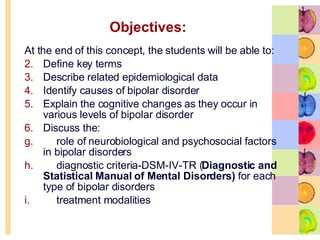 This document defines key terms related to bipolar disorder and outlines the objectives, causes, symptoms, diagnostic criteria, and treatment approaches for the different types of bipolar disorder according to the DSM-IV-TR. It discusses bipolar I disorder, bipolar II disorder, cyclothymia, and the symptoms and diagnostic criteria for mania, hypomania, depression, and mixed episodes. The causes of bipolar disorder discussed include genetic, biological, neurological, cognitive, and psychosocial factors.