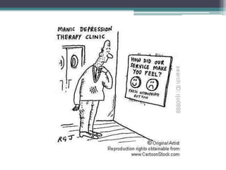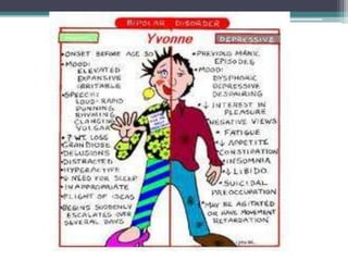 Bipolar disorders involve extreme shifts in mood between mania and depression. During manic episodes, people may feel euphoric or irritable and display symptoms like inflated self-esteem, decreased need for sleep, racing thoughts, and involvement in risky behaviors. Bipolar disorders are thought to have biological and genetic causes, and episodes can be triggered by psychosocial stressors. They are diagnosed based on the duration and severity of mood episodes as outlined in the DSM-IV criteria. Bipolar disorder can emerge at any age and often involves comorbid conditions that complicate diagnosis and treatment.
