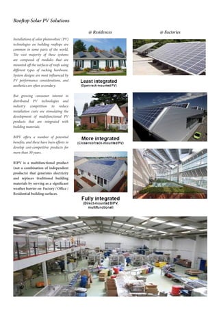 The document discusses the benefits and applications of Building Integrated Photovoltaics (BIPV) solar systems, highlighting their multifunctional properties that combine structural and energy generation roles. BIPV solutions provide cost savings, aesthetic enhancements, compliance with sustainable building standards, and reduced energy consumption for lighting and cooling. It also outlines the maintenance requirements and operational performance of solar PV systems, emphasizing the advantages of integrated designs over traditional rooftop installations.