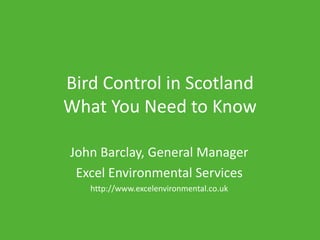 The document discusses bird control in Scotland, highlighting the problems caused by various bird species such as disease transmission, insect infestations, building damage, food contamination, safety hazards, and nuisance behavior. It emphasizes the legal basis for controlling birds within food hygiene regulations and details common urban pests like feral pigeons, house sparrows, starlings, and gulls, along with their habits and impacts. Methods for controlling gull populations, including proofing, egg management, and limited shooting, are also presented, noting the importance of professional services for effective bird control.