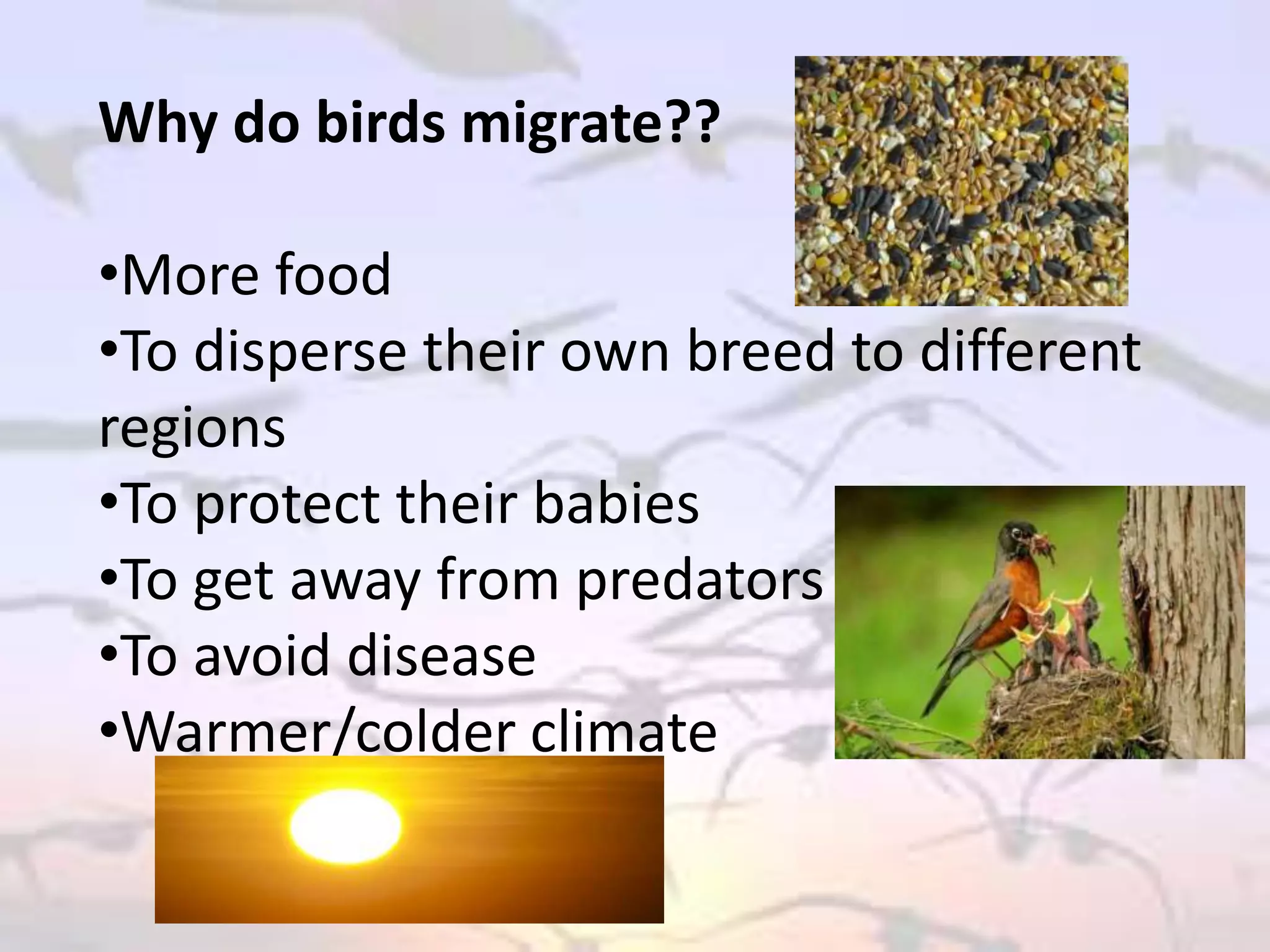 Birds migrate for reasons such as finding more food, dispersing their young, avoiding predators, and seeking more favorable climates. They navigate using the sun, stars, and landmarks, and possibly a magnetic sense. Migration is studied using bird ringing where birds are caught, tagged, and released to track their movements. Migrating birds face challenges including harsh weather, lack of resources, and threats from other birds and humans. Activities to teach children about bird migration include making bird houses, reading books, bird watching, marking routes on maps, art projects, and learning about climate and predator risks birds encounter.
