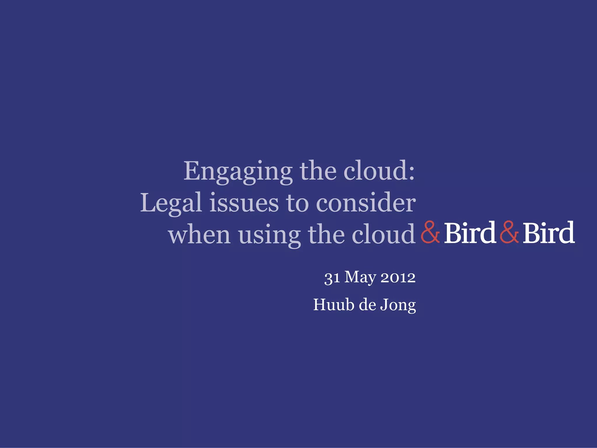 This document summarizes some key legal issues to consider when using cloud computing services. It defines cloud computing and outlines its different forms. It discusses potential benefits like reduced costs but also risks around data security, compliance, and dependence on internet connectivity. The document then focuses on data protection compliance, specifically regarding the EU Data Protection Directive, US Patriot Act, and transferring data to third parties. Finally, it provides suggestions for issues to address in cloud service agreements like data ownership, security standards, portability, and exit plans.