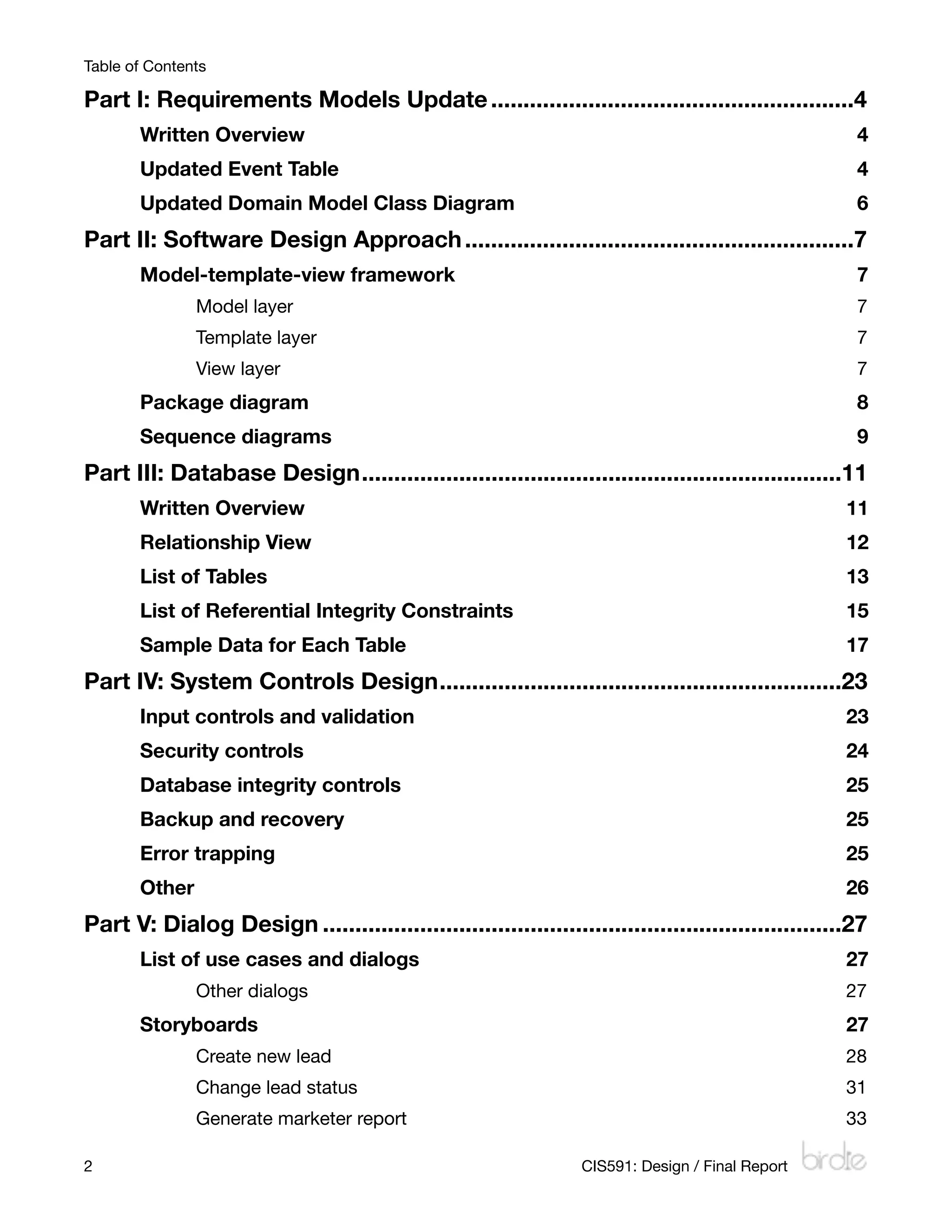 The document provides an overview and updates to the system requirements models for a web application called 'Birdie' that manages sales leads. It includes an updated event table removing one use case and making another singular. It also includes an updated domain model class diagram with some changes like additional report classes. The software design approach section describes the model-template-view framework used with Django including details on each layer. It includes package and sequence diagrams to illustrate the design.