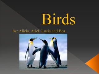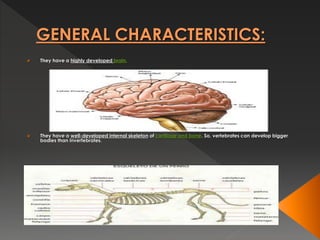 Vertebrates have several key characteristics including a highly developed brain, well-developed internal skeleton, advanced nervous system, sensory organs, ability to learn from mistakes, and ability to adapt to various habitats due to their skeletons and nervous systems. They also have respiratory systems using gills or lungs, protective skin, and bilateral symmetry. Birds are vertebrates that eat a protein-rich diet for flight energy, maintain body temperature through activity and warm blood, and reproduce through eggs with amniotic sacs and shells that hatch into chicks able to feed themselves.