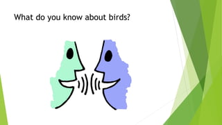 Birds are vertebrates that have feathers and lay eggs. They have two legs and while most birds can fly, some like ostriches and penguins cannot. Birds come in many varieties such as ducks, owls, flamingos, eagles, parrots and vultures.