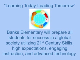 Banks Elementary provides an overview of its mission and programs for the 2012-2013 school year. It prepares students for success using 21st century skills within a supportive learning environment. The document also provides information about carpool times, Banks being a Title I school which supports teaching positions and technology with federal funding, and opportunities for parent involvement. Upcoming dates are listed, including progress reports, holidays, and the holiday shoppe. The document concludes with samples of student work on different bird species.