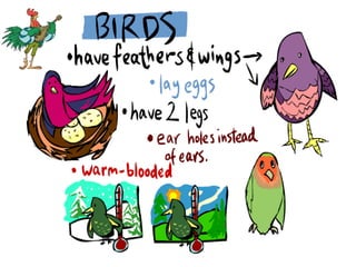 This document describes the key characteristics of birds. It lists the main external features of birds, such as beaks, feathers, wings, legs and tails. It then provides some general information about birds - they are vertebrates that lay eggs, most have feathers and can fly, though some like penguins cannot, and they have warm blood, breathe through lungs and live mainly on land but some live in water. The document also lists examples of different types of birds.