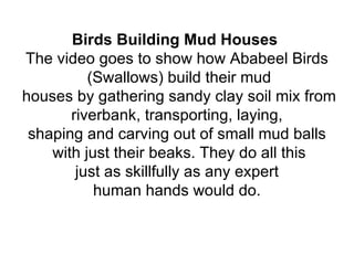 Ababeel birds build mud houses by gathering sandy clay soil from riverbanks, transporting and shaping small mud balls with their beaks to lay and carve out houses, doing so as skillfully as expert human hands could.