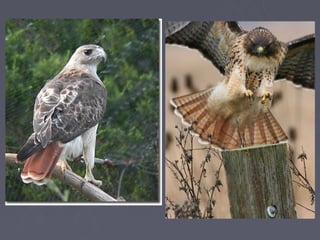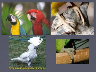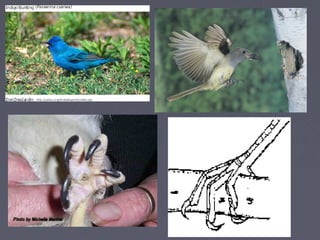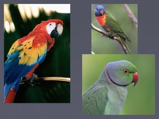 This document discusses different orders of birds and their characteristics. It describes three main bird orders: Psittaciformes which have large beaks used for climbing and feeding; Piciformes like woodpeckers that have long hard beaks and eat fruits, vegetation, and insects; and Passeriformes which are perching birds with 4 toes and small but strong beaks. It also discusses birds of prey like falcons and owls that have sharp beaks and talons adapted for tearing flesh. Finally, it provides details on penguins, noting the 18 species live in the Southern Hemisphere and are specialized for swimming with paddle-like forelimbs and rear-positioned feet.
