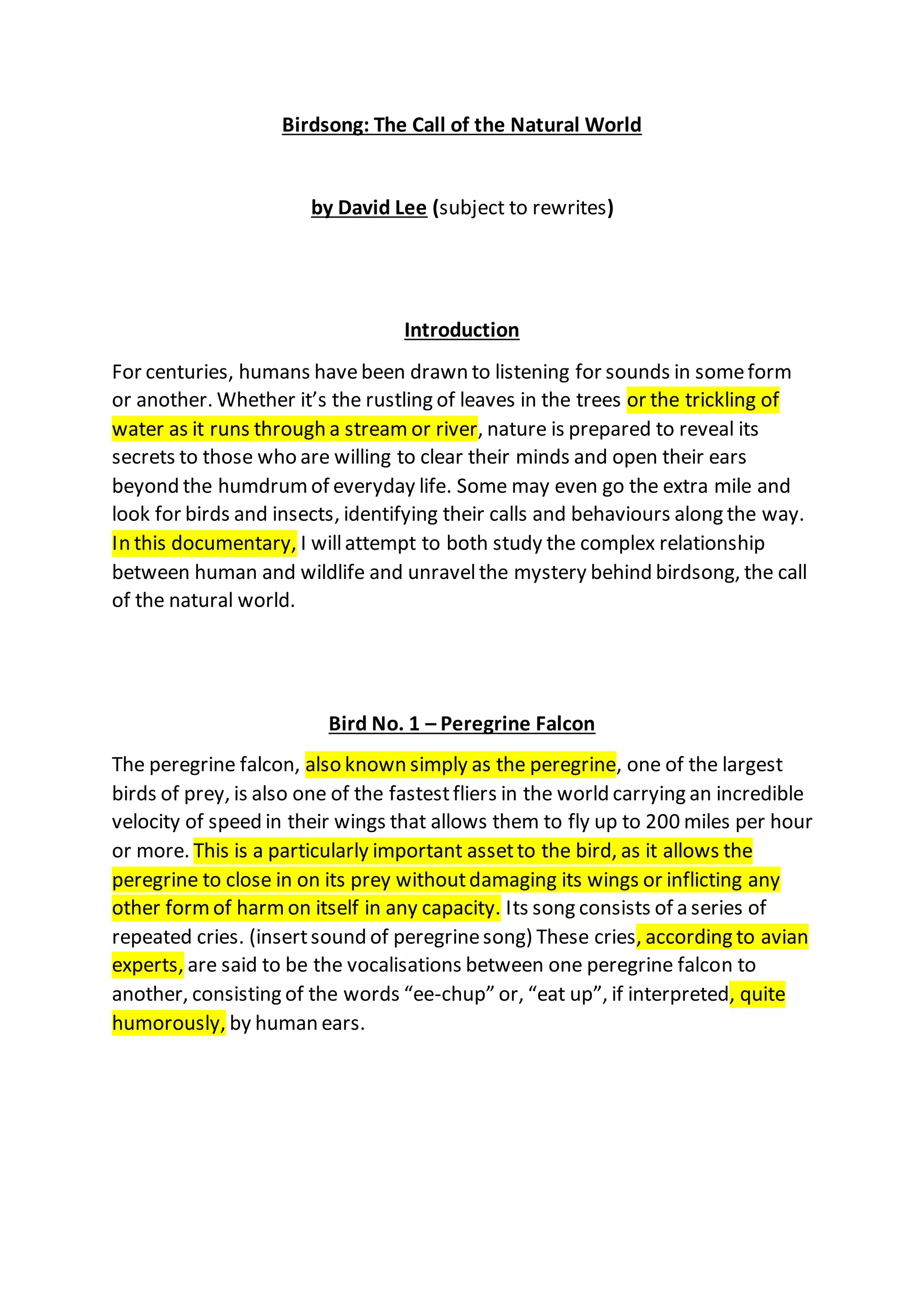 The document explores the intricate relationship between humans and wildlife, particularly through the lens of birdsong, highlighting various bird species such as the peregrine falcon, common starling, wren, and robin. Each bird's unique vocalizations are described, emphasizing their roles in communication, mating, and territory defense. Ultimately, the text advocates for the preservation of natural habitats to maintain the vital presence of birdsong in the ecosystem.