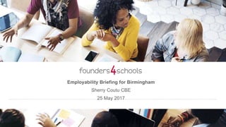 The document discusses the skills gap among young people in the UK and solutions to address it. It notes that most new jobs are created by small, young companies and the pace of change is increasing. There is a major skills gap according to CEOs and growing companies, which is expected to get larger. It promotes getting students encounters with employers through programs like Founders4Schools to improve employability, attainment, and earnings. Call to actions are provided for educators, businesses, corporations, local governments, parents, and media to get involved in student-employer encounters and work experiences.