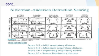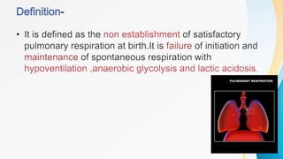 Birth asphyxia and respiratory distress are common conditions in newborns that can lead to neonatal death if not properly managed. Birth asphyxia is caused by a lack of oxygen during delivery and is diagnosed using the Apgar score and umbilical cord blood pH. Respiratory distress in newborns has pulmonary causes like respiratory distress syndrome or nonpulmonary causes like perinatal asphyxia. Management of both conditions involves providing oxygen, monitoring vital signs, treating infections, and supporting respiratory and cardiovascular functions. Timely identification and treatment can improve prognosis.