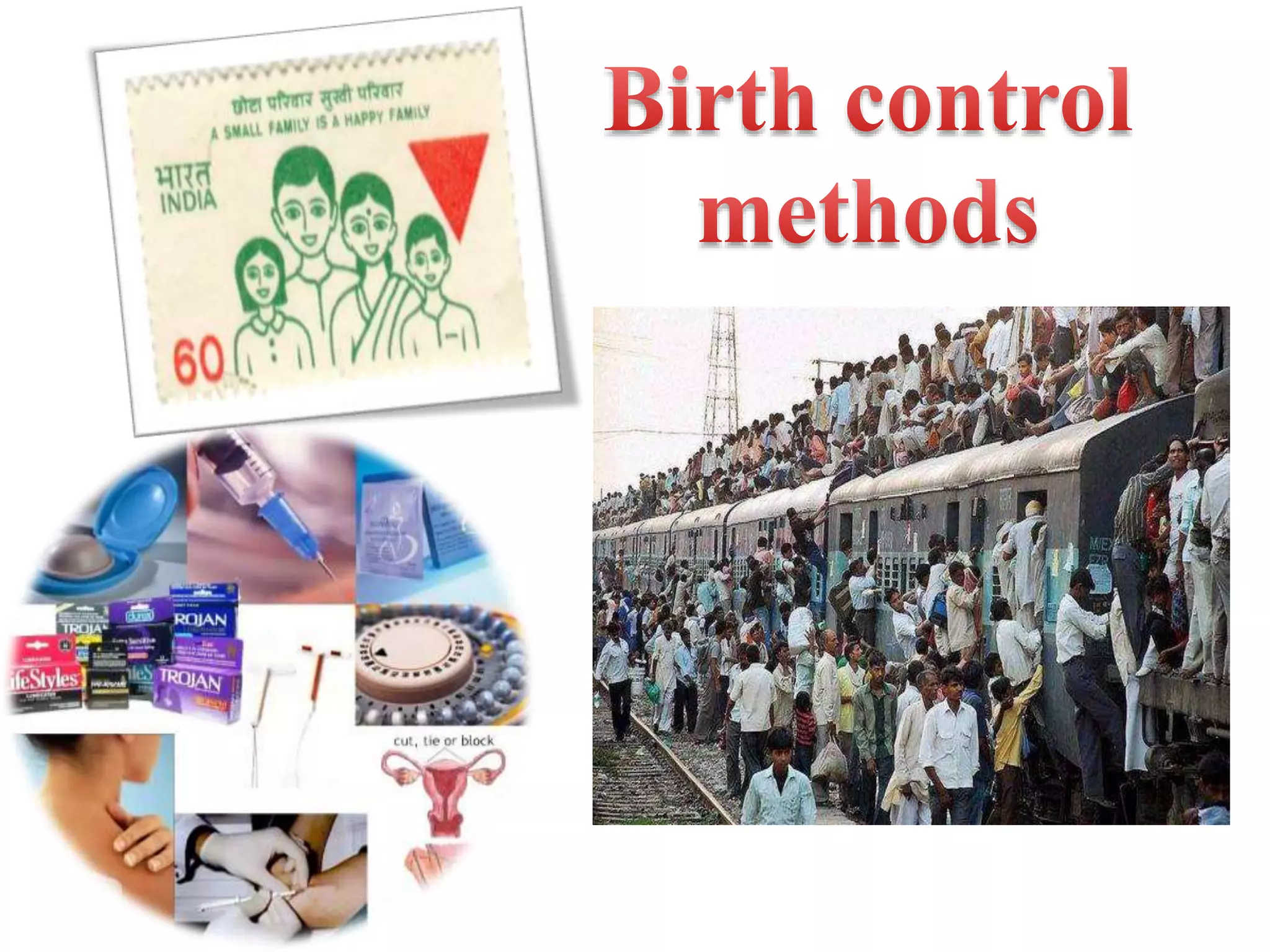 Population growth is steadily increasing, which can be controlled by decreasing births. The best way is birth control, which prevents fertilization through various methods like intrauterine devices, hormonal methods, barriers, natural methods, emergency contraception, surgical sterilization, and vaccines currently in development. Common birth control methods include copper-T or Lippes loop IUDs inserted in the uterus, hormonal pills, injections, implants and patches, male condoms, female sterilization procedures like tubectomy, and male vasectomy.